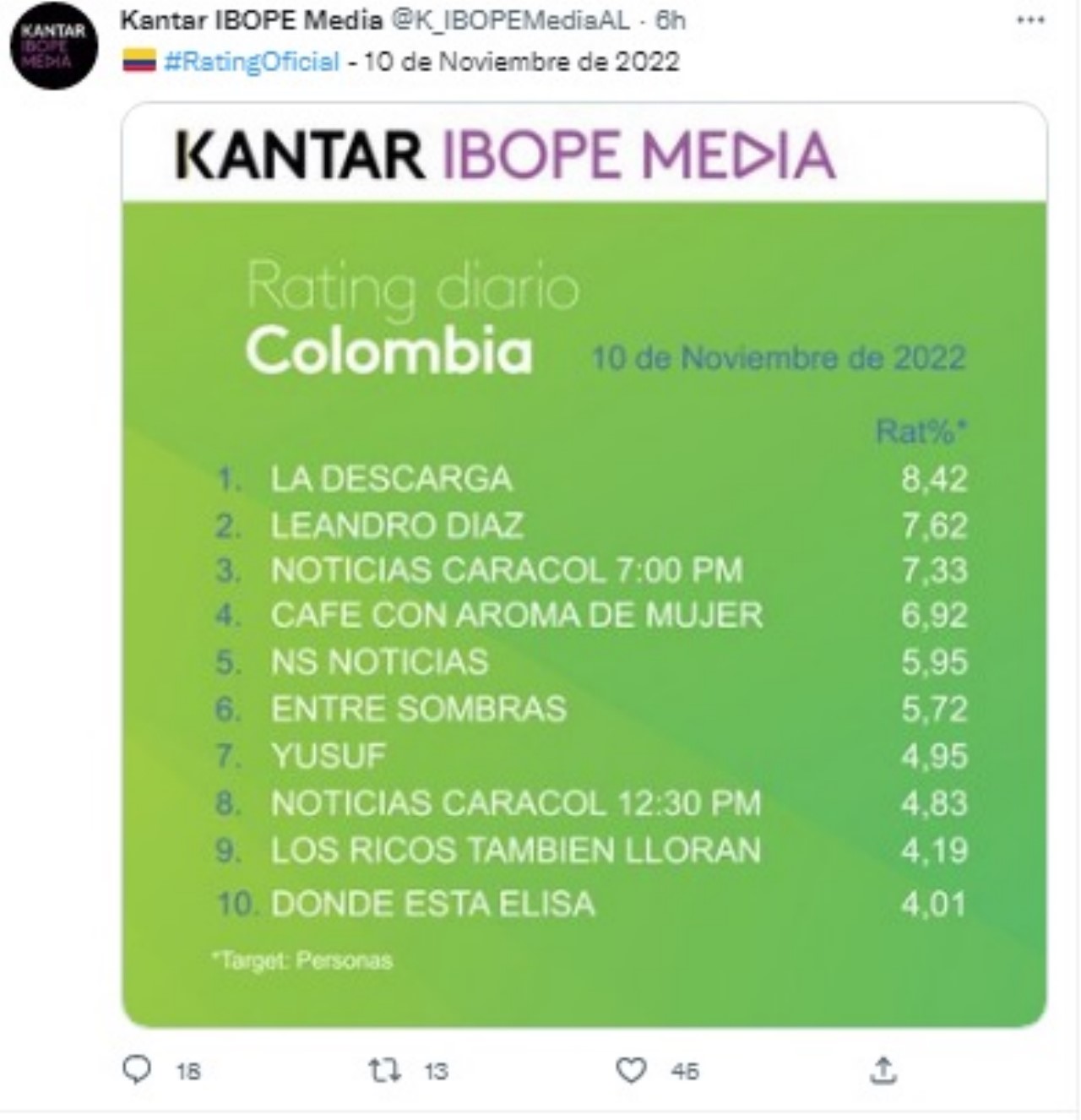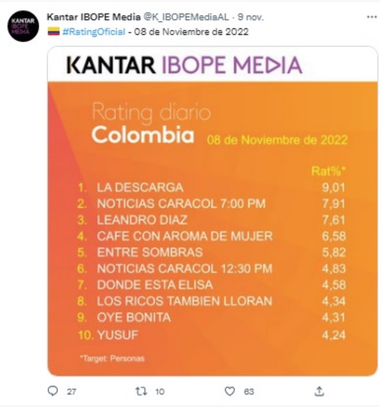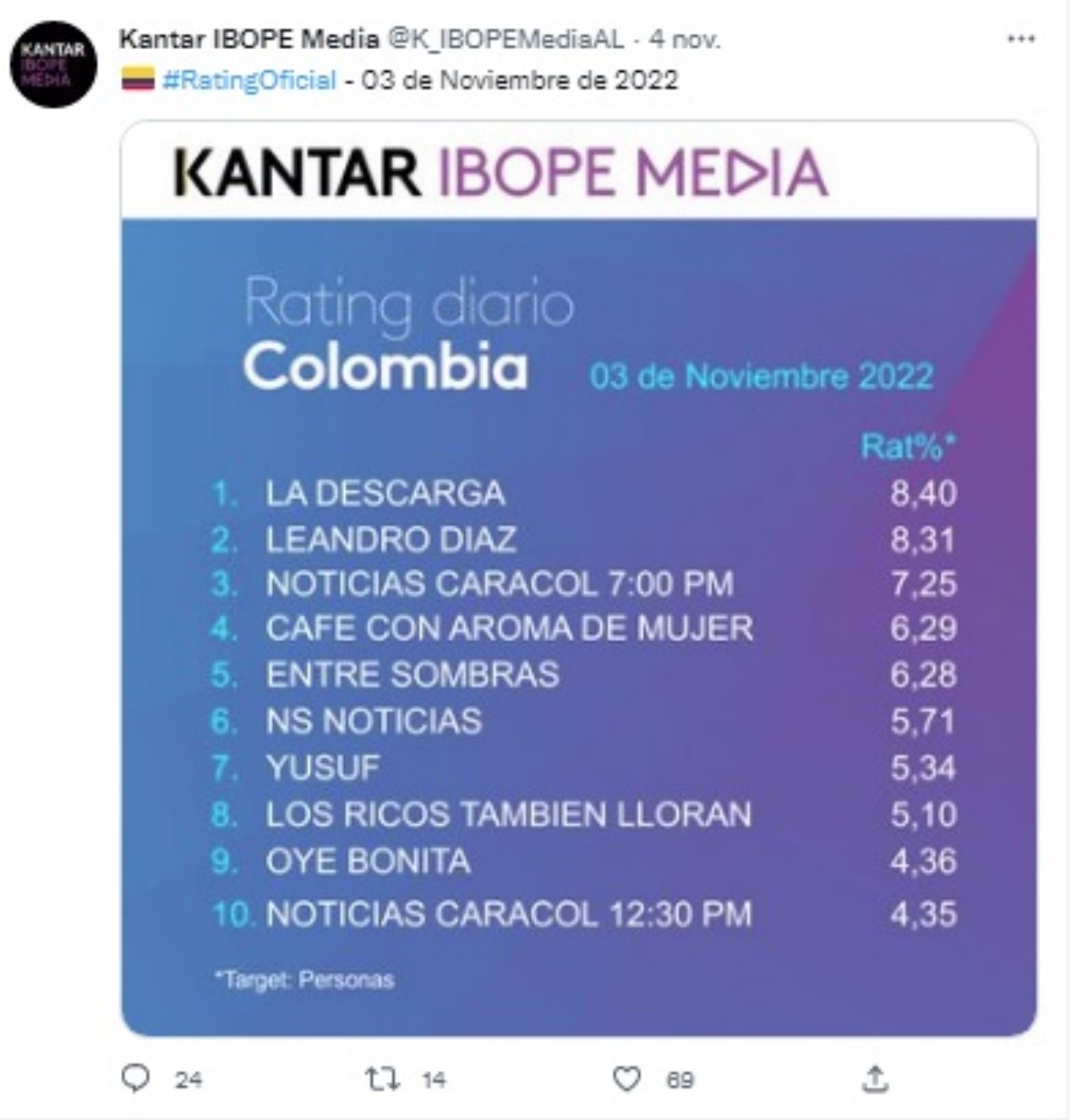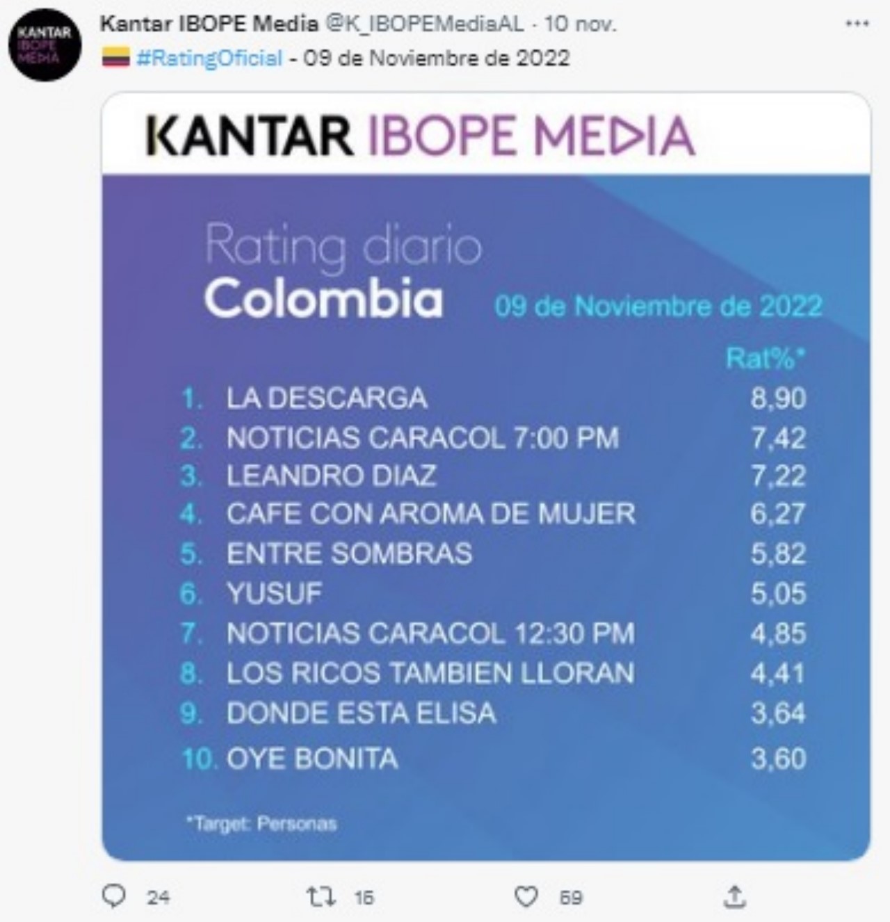 Según cifras de Kantar Ibope Media, “La descarga” se ubicó como el programa más visto de Colombia.