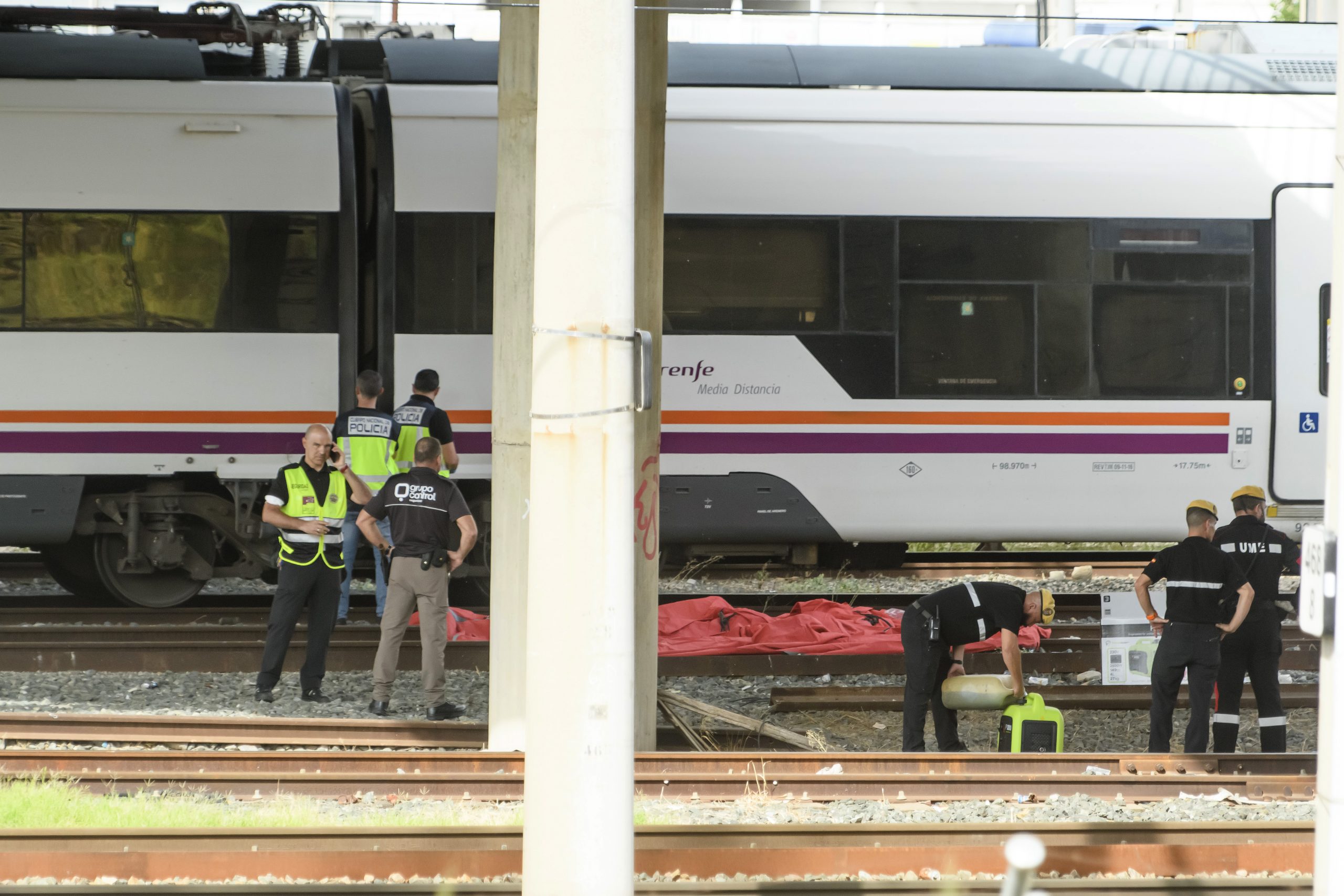 Un dispositivo policial se encuentra esta mañana inspeccionando el tren donde ha sido encontrado el cuerpo, que ahora está en una zona de mantenimiento de Adif a algo más de un kilómetro de la estación.
