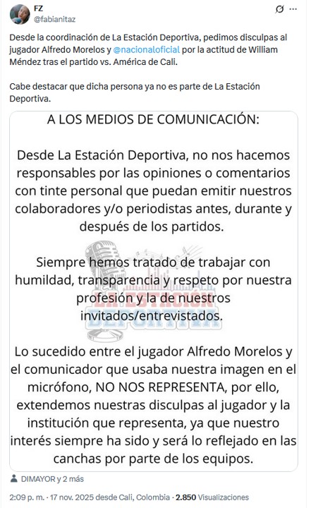Resumen: "La Estación Deportiva" emite comunicado oficial disculpándose con Nacional y Alfredo Morelos por el incidente. Confirman el despido de William Méndez y reafirman su compromiso con el respeto.