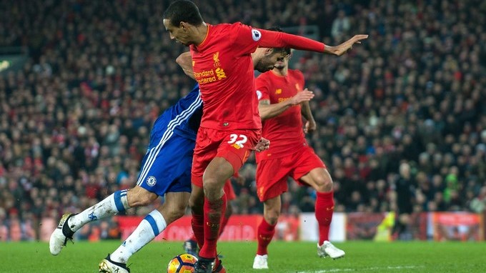 Joel Matip (c) de Liverpool comete una falta de penalti a Diego Costa (i) de Chelsea