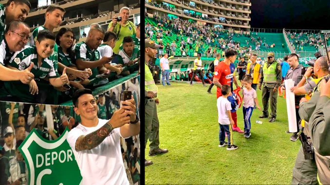 • Pese a que Independiente Medellín cayó derrotado ante el Cali por la mínima diferencia en Palmaseca, el delantero del elenco antioqueño, Germán Cano, se robó las miradas de los azucareros sobre todo con el gran gesto de tomarse fotos con ellos.