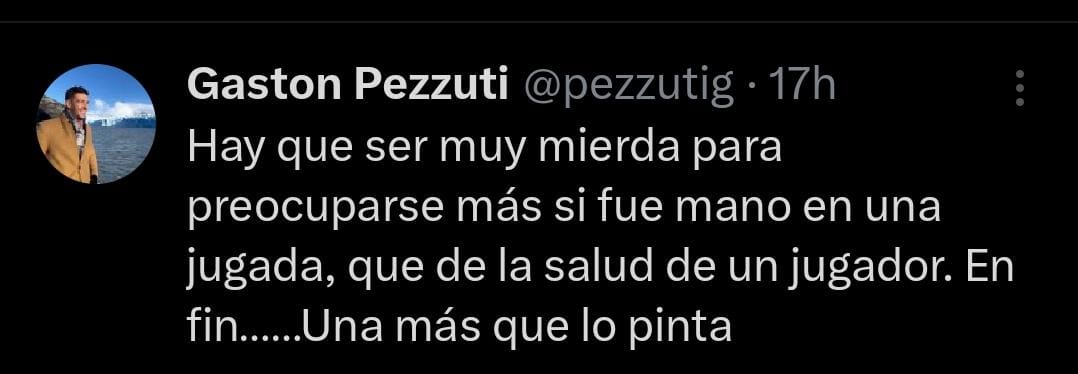 A través de su cuenta de X, Pezzuti escribió “hay que ser muy mierda para preocuparse más si fue mano en una jugada, que de la salud de un jugador”.
