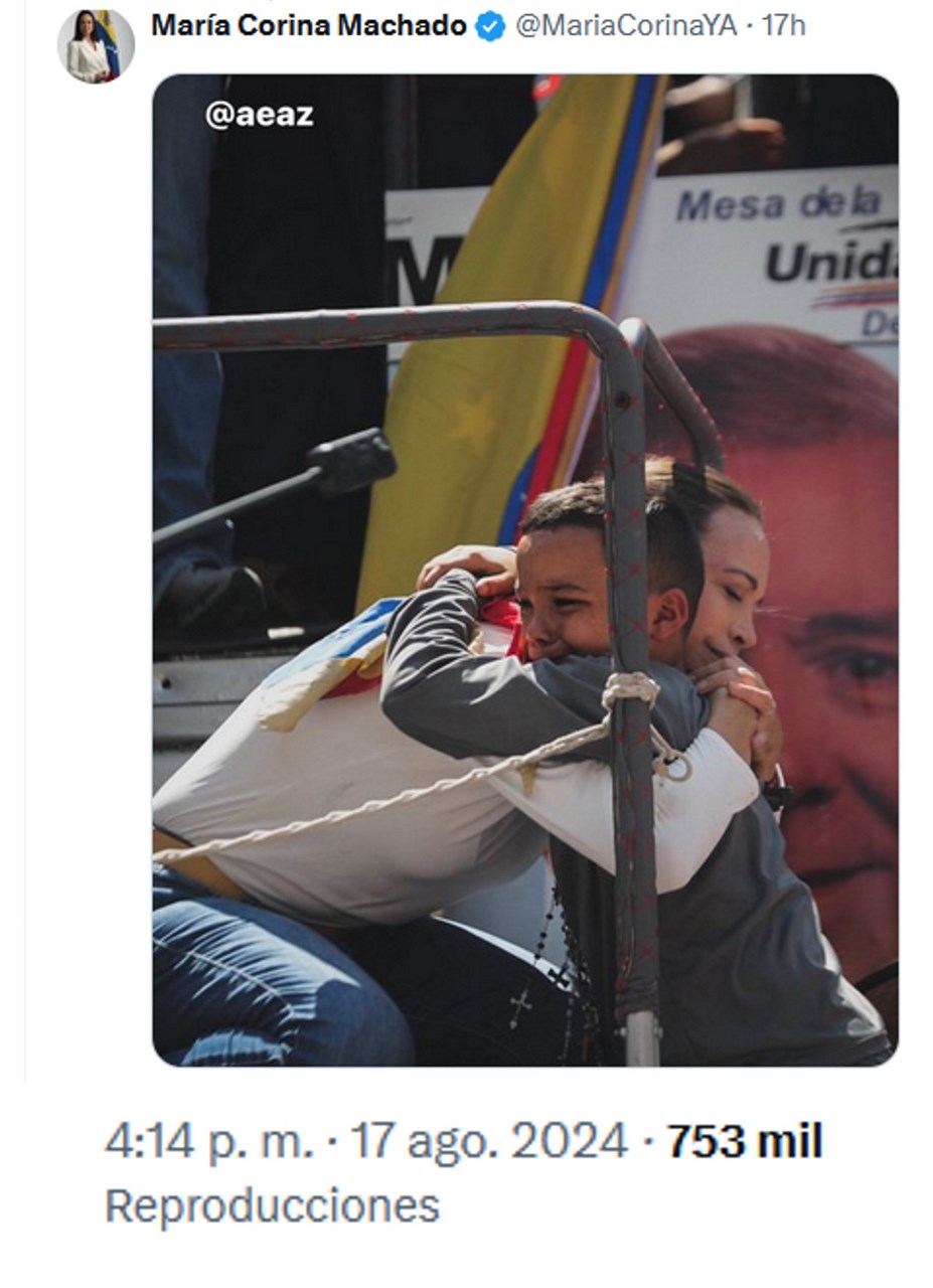 Sin embargo, una imagen en particular ha tocado el corazón del mundo entero. María Corina Machado, líder opositora y símbolo de la resistencia venezolana, fue fotografiada abrazando a un niño que no pudo contener el llanto. La fotografía ha dado la vuelta al mundo.