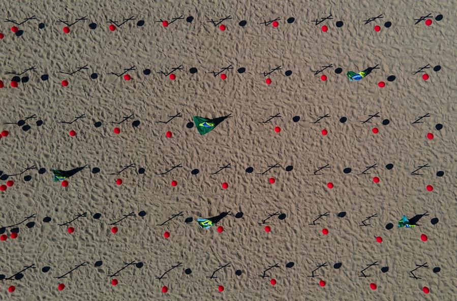 Para homenajear a quienes perdieron la vida por la COVID-19, mil globos inflados con helio fueron esparcidos en la playa más famosa de Brasil y un centenar de ellos permanecieron anclados sobre cruces negras simbolizando a las víctimas que perdieron la vida en su lucha contra el virus.