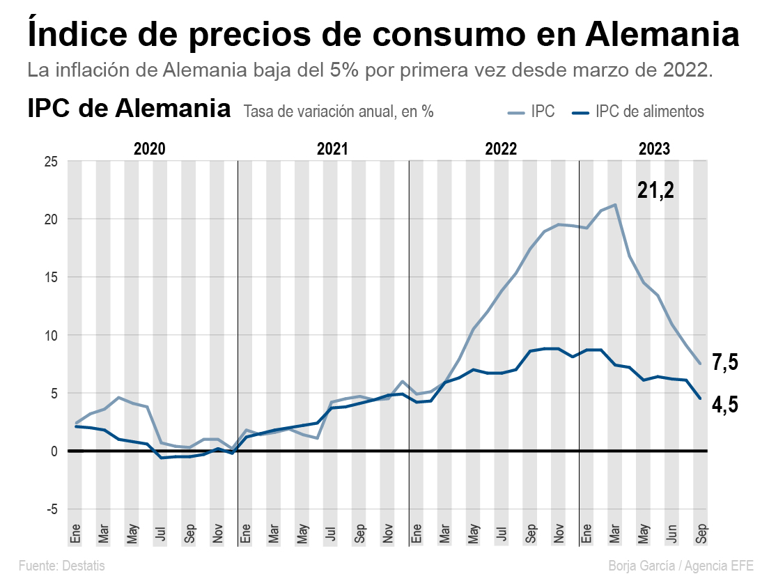 Berlín, 28 sep (EFE).- La tasa de inflación cayó en Alemania en septiembre al 4,5 % interanual, según las cifras provisionales publicadas este jueves por la oficina federal de estadísticas, que indicó que se trata del nivel más bajo desde el inicio de la guerra en Ucrania, en febrero de 2022.