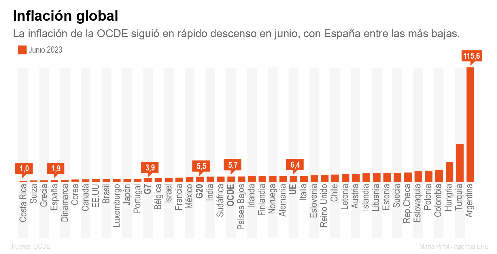 Más allá de la OCDE, entre los miembros del G20 la inflación cayó en el mes del 5,9 % al 55,5 %, con el IPC de China cayendo a cero, su nivel más bajo desde febrero de 2021 y decrecimientos destacados también en Sudáfrica, Brasil e Indonesia. Por contra, volvió a subir en Argentina, donde sigue disparada con un 115,6 % frente al 114,2 % de mayo.