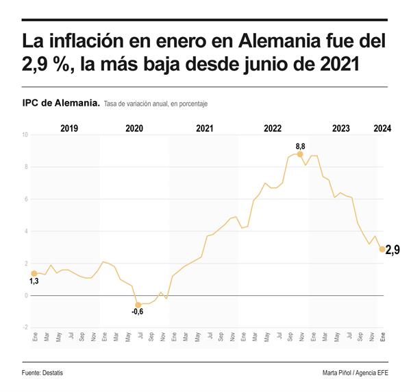 Berlín, 9 feb (EFE).- La tasa interanual de inflación en Alemania fue en enero del 2,9 %, el nivel más bajo desde junio de 2021 cuando había estado en el 2,4 %, informó este viernes la Oficina Federal de Estadística (Destatis).