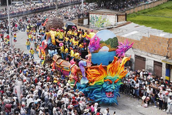El desfile acaba con las más grandes carrozas, tan altas que tienen que transitar con más cuidado que las pequeñas, pero la emoción que traen, junto con la espuma y los dulces que lanzan, hace que Pasto despierte a su paso.