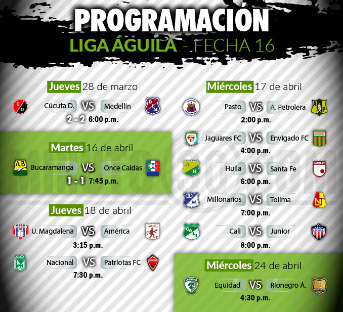 La jornada, que se abrió con el partido adelantado entre Cúcuta Deportivo e Independiente Medellín, que igualaron 2-2 en el Estadio General Santander, se reactivó este 16 de abril con el empate (1-1) entre Atlético Bucaramanga y Once Caldas.