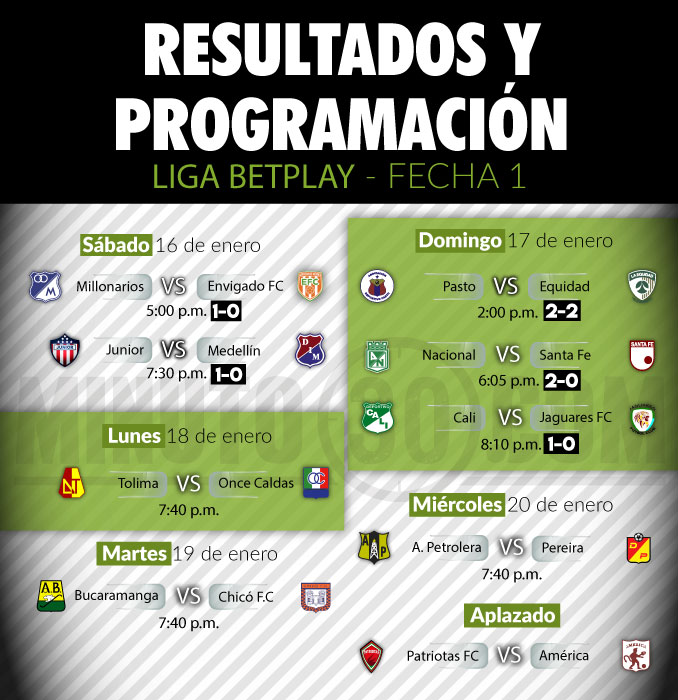 El sábado, en la apertura de la fecha, Millonarios le ganó a Envigado 1-0 y Junior superó a Independiente Medellín, por idéntico margen.