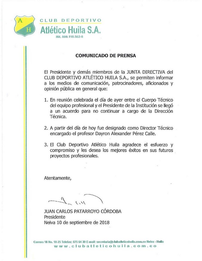 Minuto30.com- La Liga Águila II-2018 no para de cobrar cabezas. En las últimas horas se confirmó la salida del cuerpo técnico del Atlético Huila, que encabezaba el  argentino Néstor Craviotto.