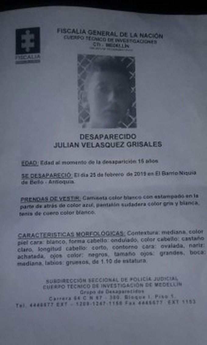 El pasado lunes 25 de febrero desapareció Julián Velásquez Grisales, de 15 años de edad, en el barrio Niquía de Bello.