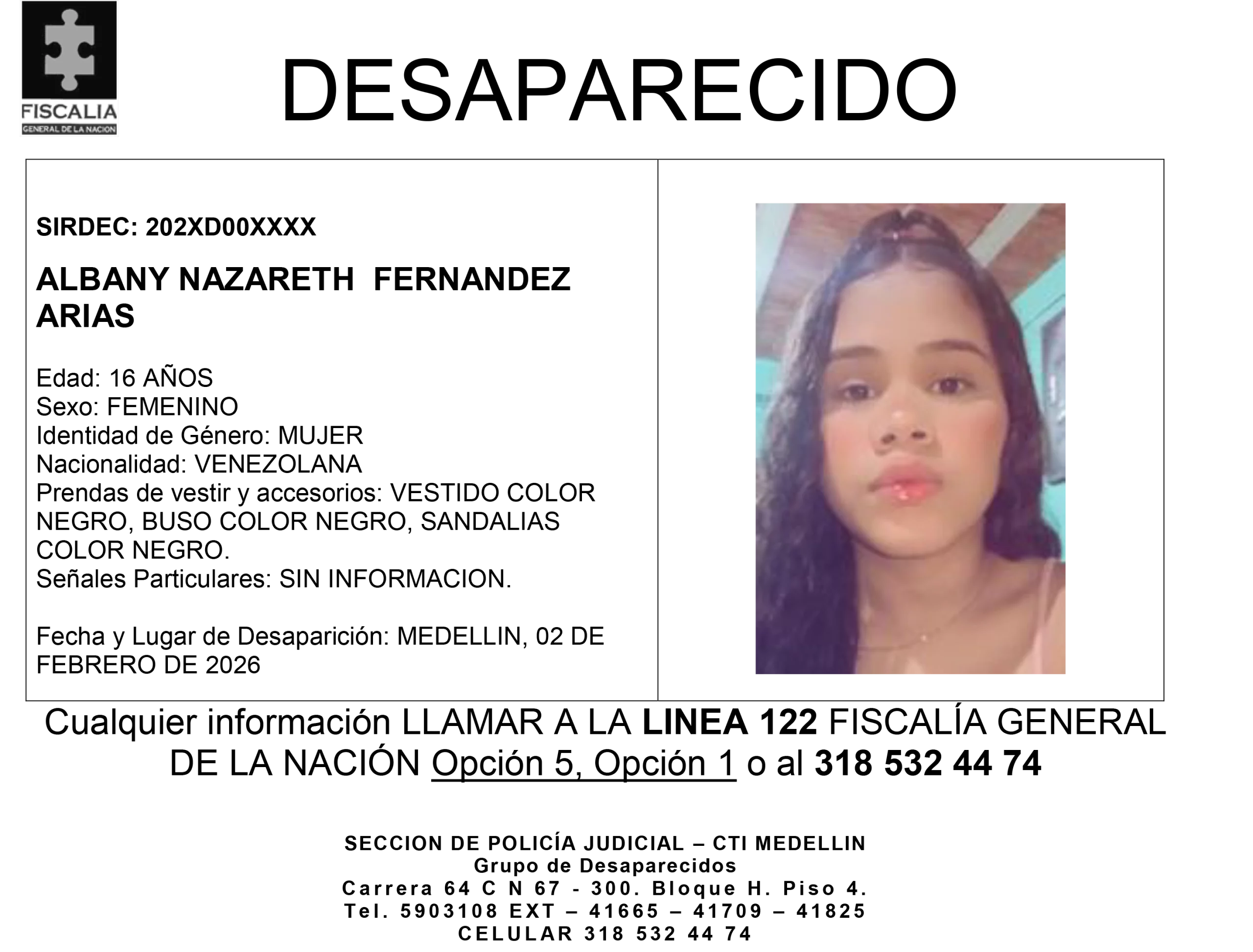 Albany Nazareth Fernández Arias es una adolescente de 16 años, de nacionalidad venezolana. Se identifica como mujer y, al momento de su desaparición, no se reportaron señales particulares que permitan distinguirla físicamente.