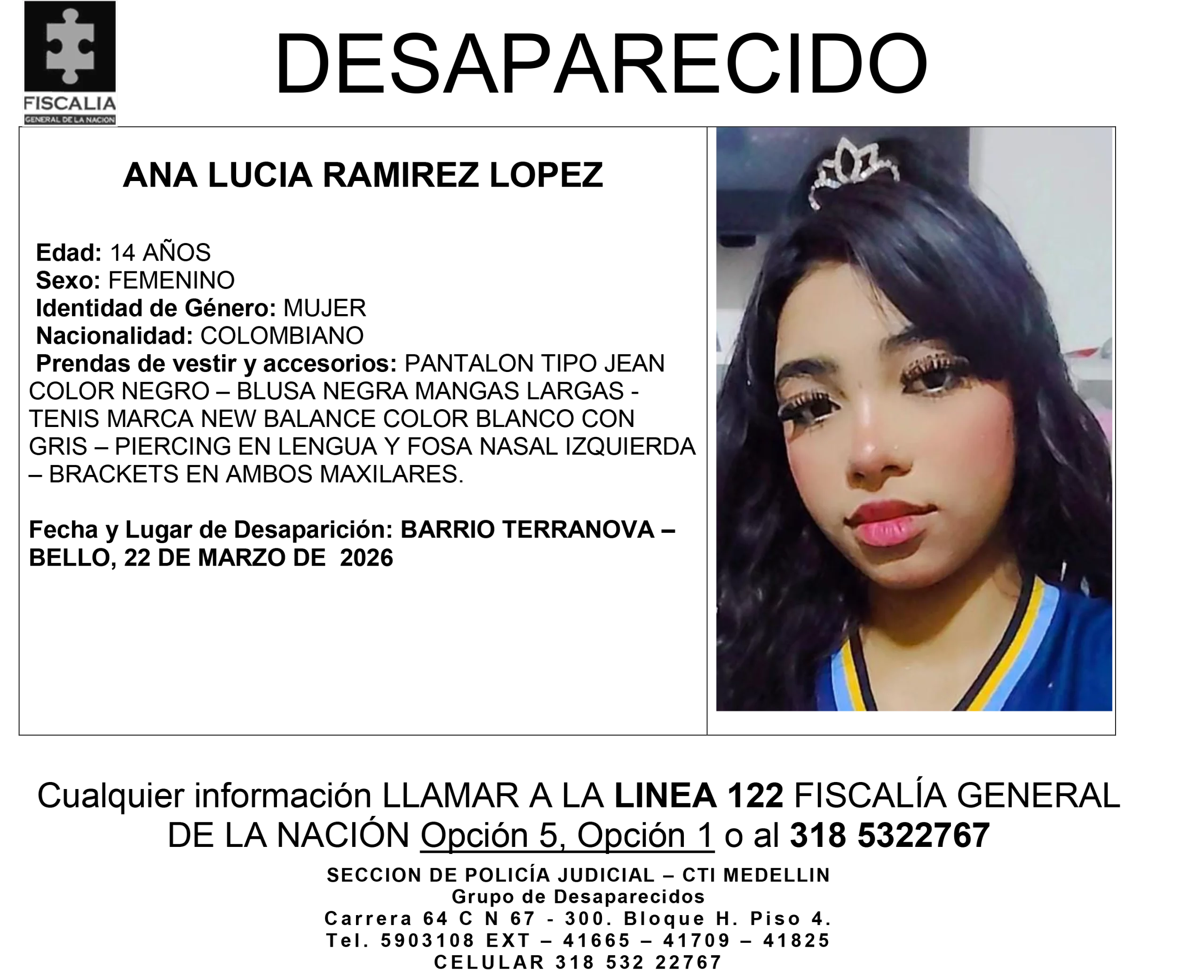 Resumen: Ana Lucía Ramírez López es una adolescente de 14 años, de sexo femenino e identidad de género mujer, de nacionalidad colombiana. Al momento de su desaparición vestía un pantalón tipo jean negro, blusa negra de mangas largas y tenis marca New Balance en color blanco con gris. Como rasgos distintivos, tiene un piercing en la lengua, otro en la fosa nasal izquierda y brackets en ambos maxilares.