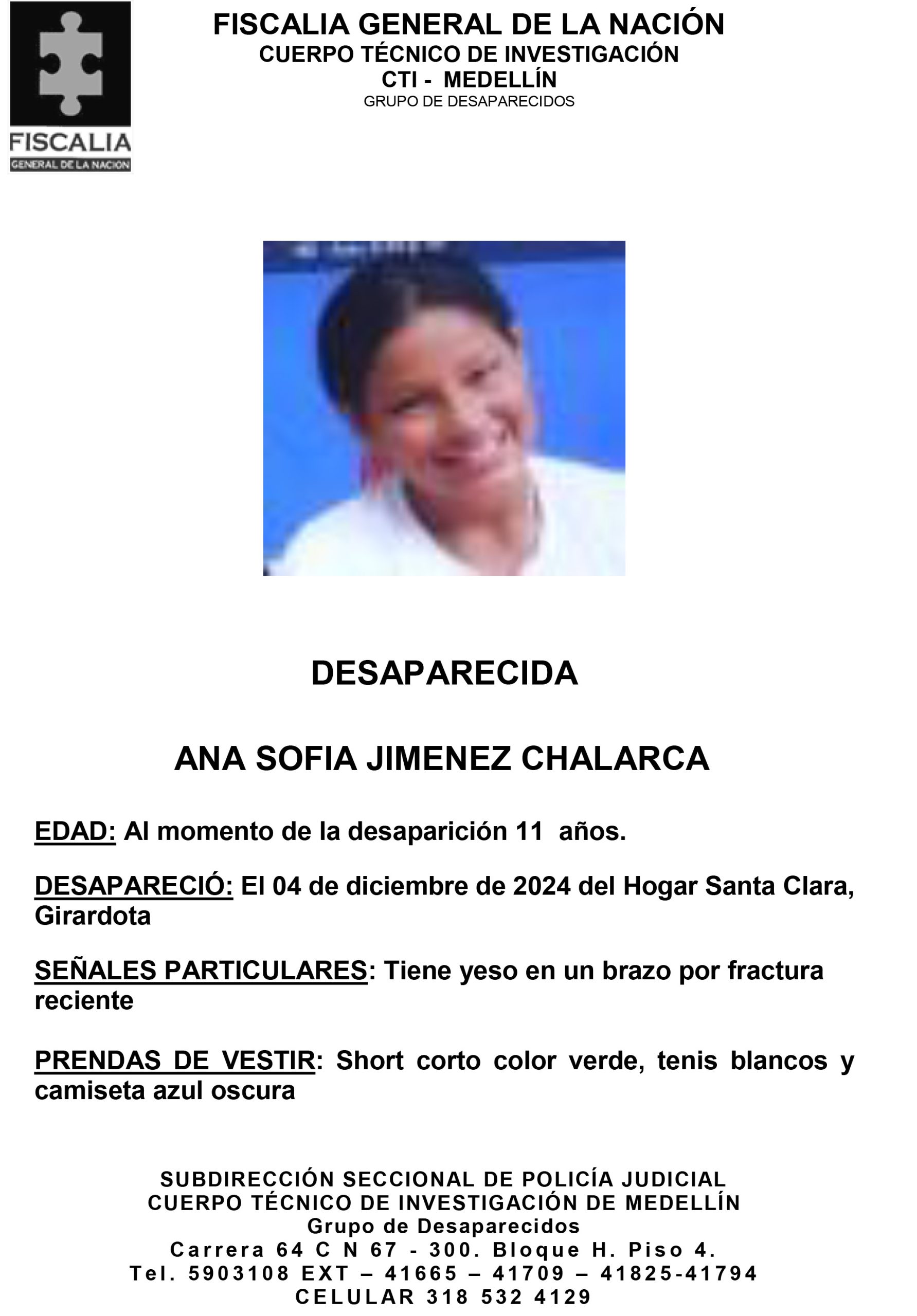 Resumen: Ana Sofía Jiménez Chalarca, una niña de 11 años, desapareció el 4 de diciembre de 2024 del Hogar Santa Clara, ubicado en Girardota.