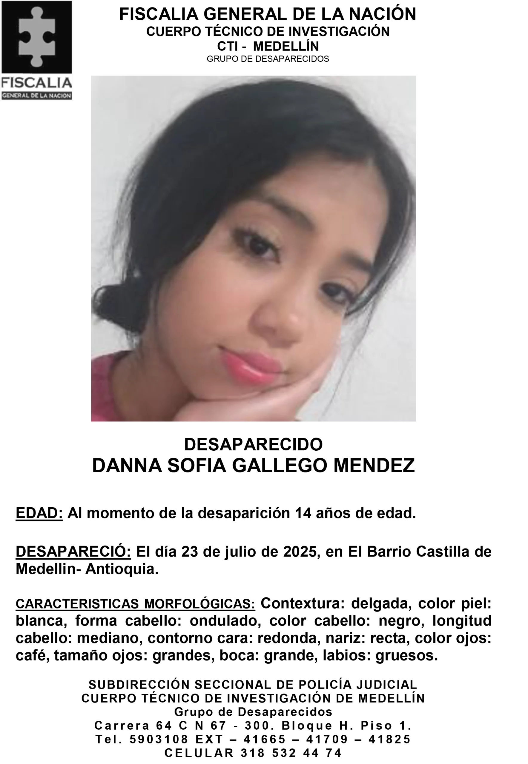 Danna Sofía Gallego Méndez, una menor de 14 años, fue reportada como desaparecida el 23 de julio de 2025 en el barrio Castilla, ubicado en la ciudad de Medellín, Antioquia.