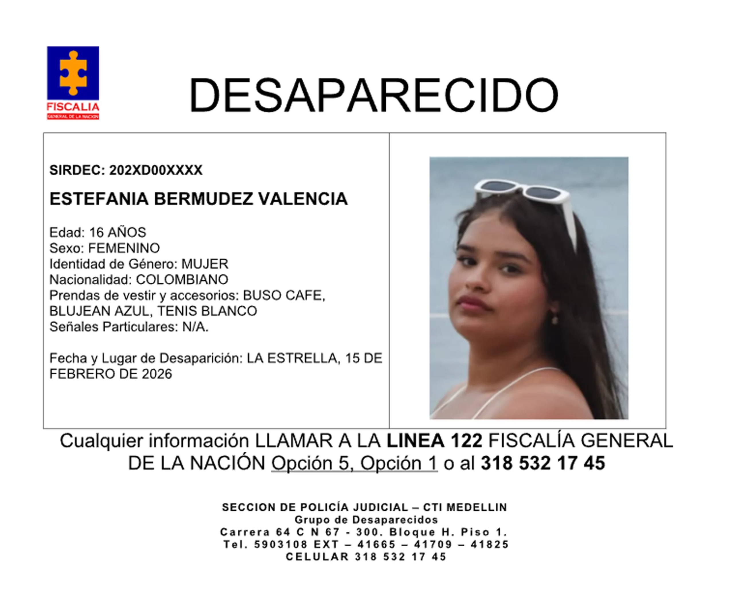 La joven fue vista por última vez el 15 de febrero de 2026 en el municipio de La Estrella. Desde esa fecha no se tiene información sobre su paradero, lo que ha generado preocupación entre sus familiares y la comunidad.