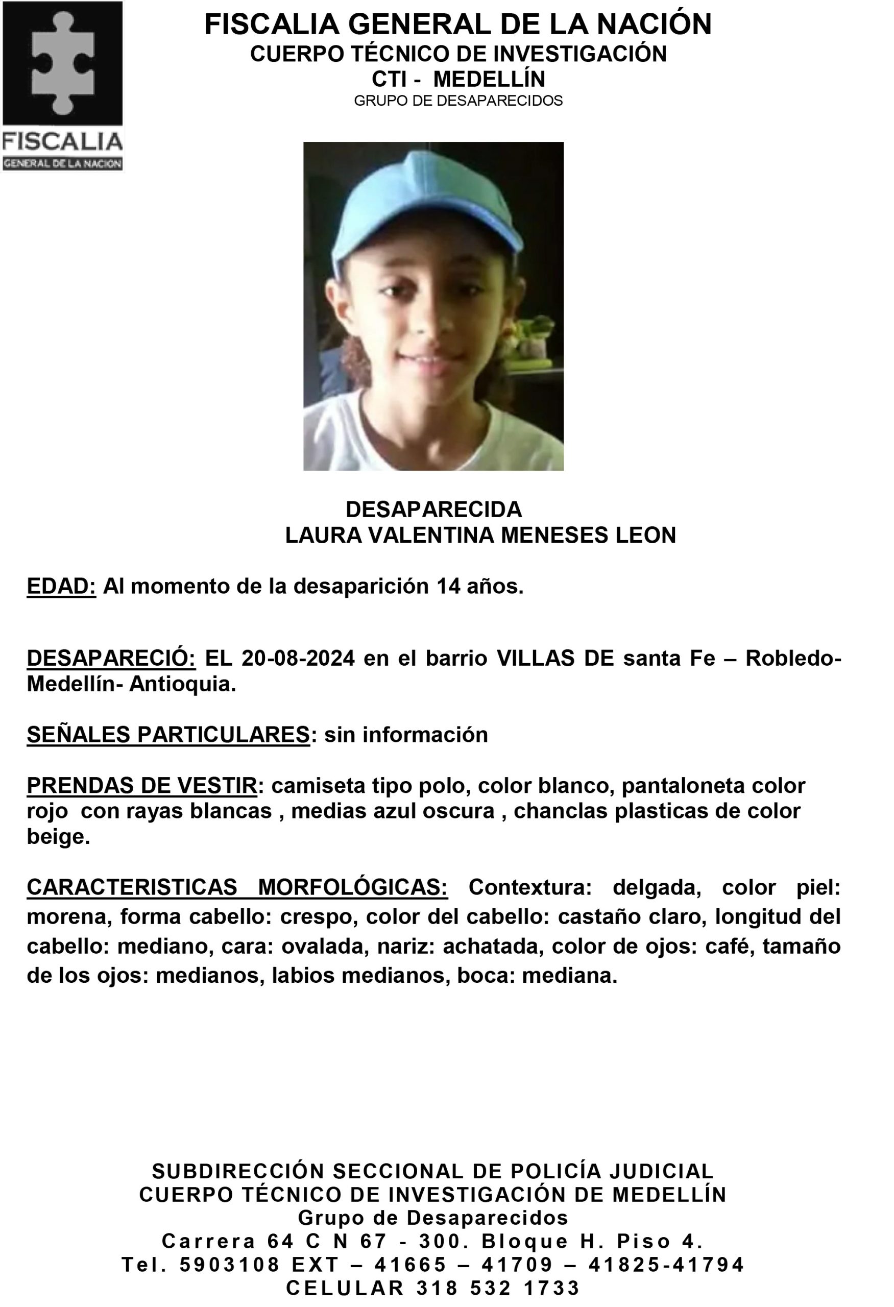 Resumen: Laura Valentina Meneses León, de 14 años, fue reportada como desaparecida el 20 de agosto de 2024 en el barrio Villas de Santa Fe, ubicado en la comuna de Robledo, Medellín, Antioquia.