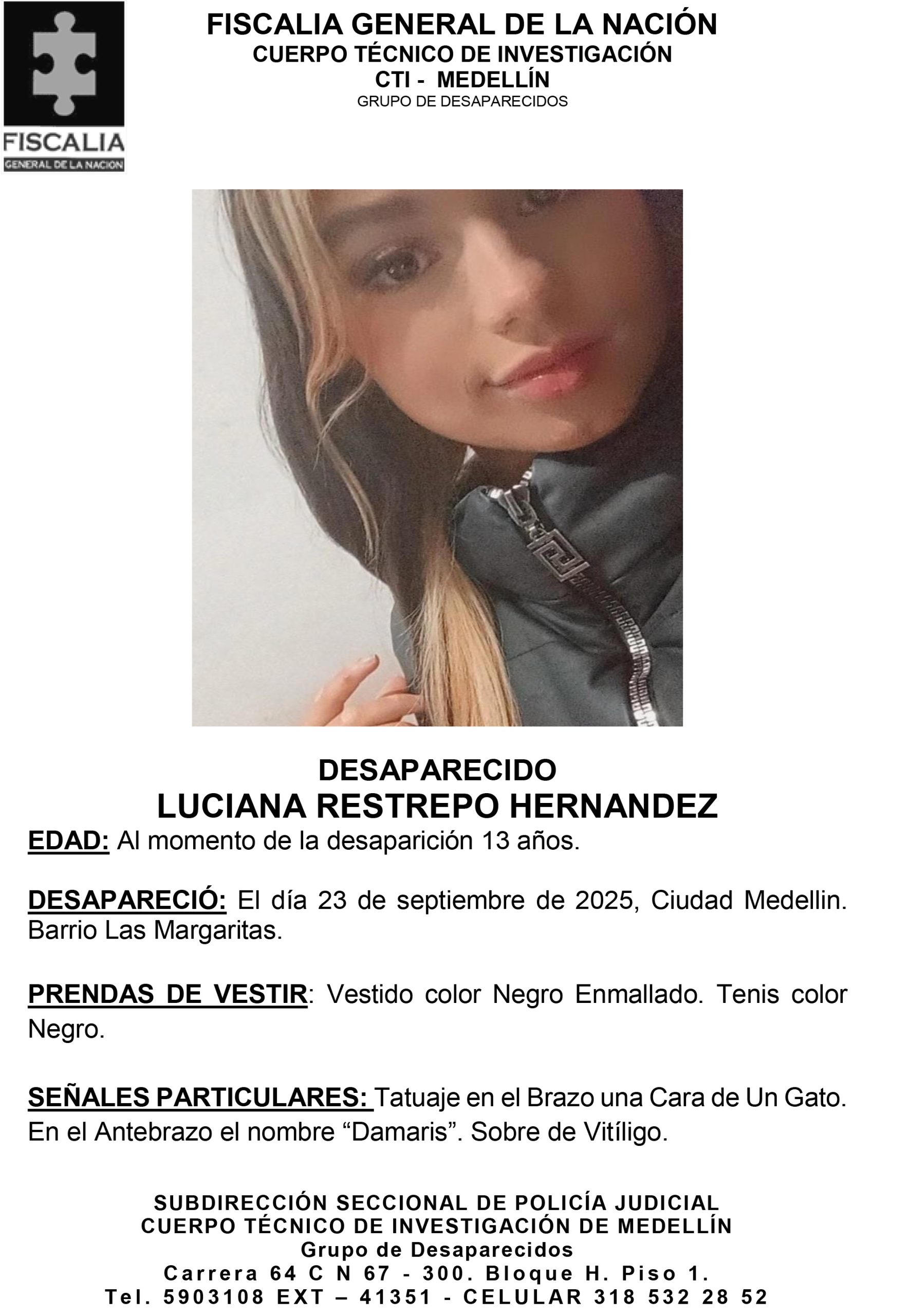 Luciana Restrepo Hernández, una adolescente de 13 años, desapareció el 23 de septiembre de 2025 en la ciudad de Medellín, específicamente en el barrio Las Margaritas.
