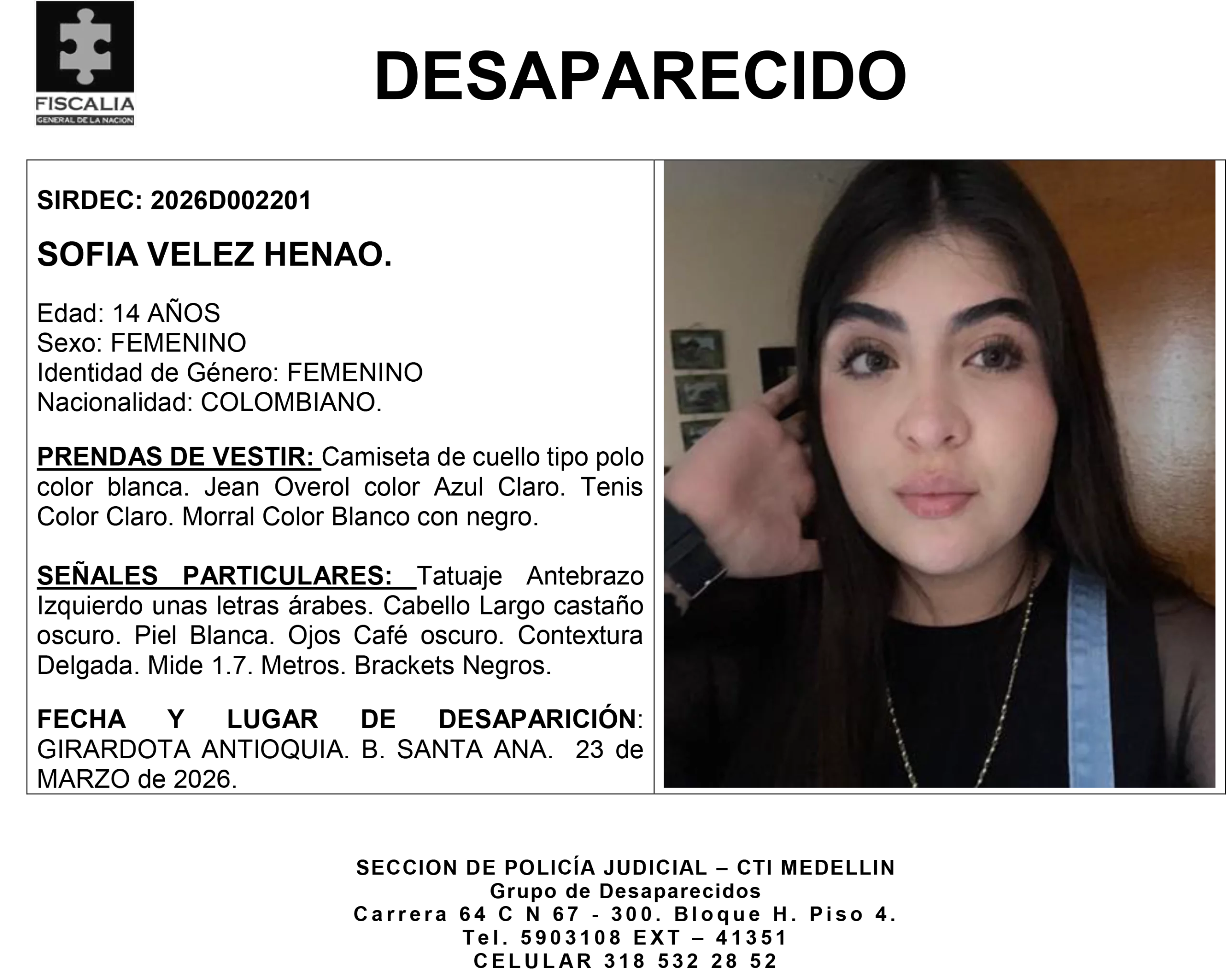 La joven fue reportada como desaparecida el 23 de marzo de 2026 en el barrio Santa Ana, en el municipio de Girardota, Antioquia. Desde esa fecha no se tiene información sobre su paradero.