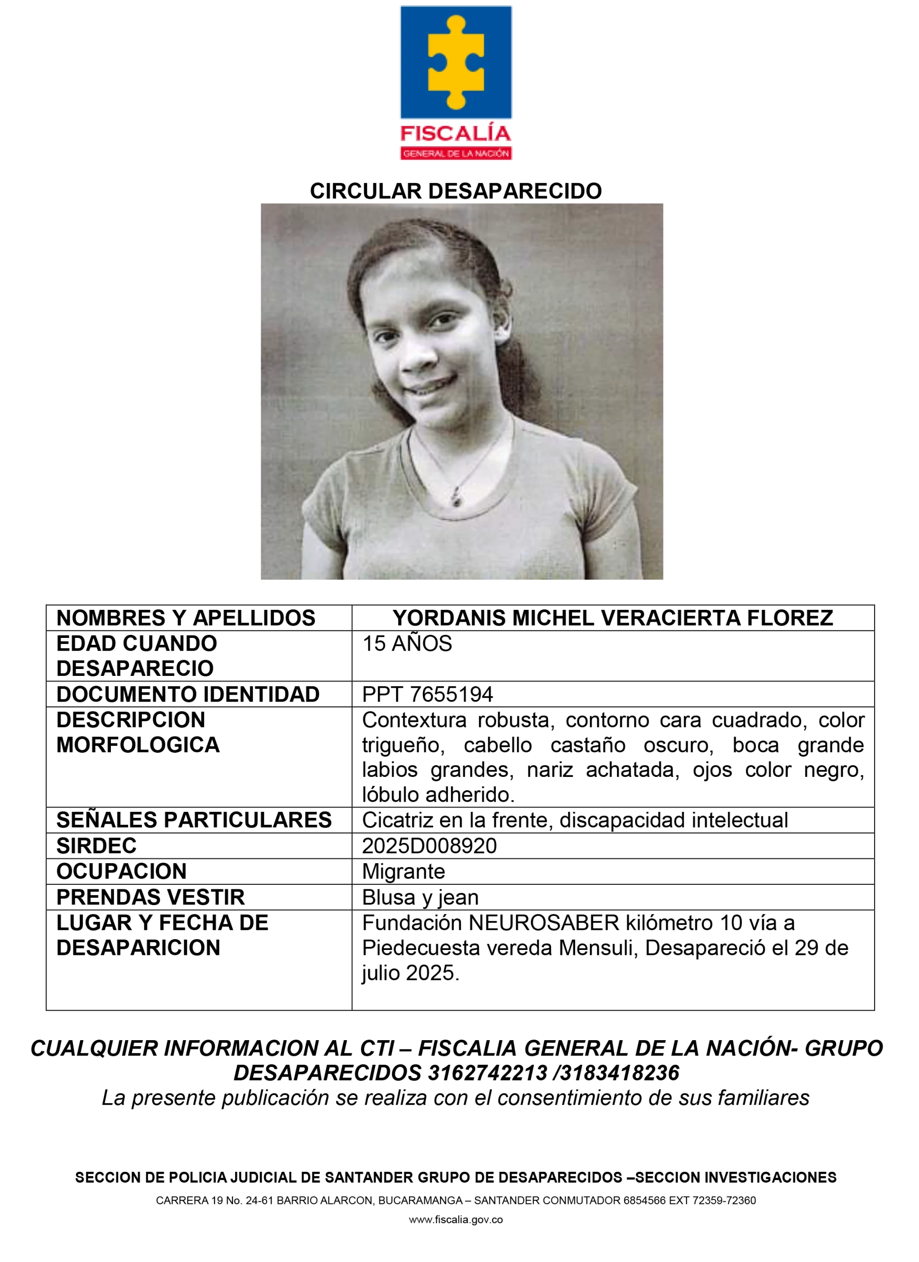 Cualquier información que permita dar con su paradero debe ser comunicada de manera inmediata al CTI de la Fiscalía General de la Nación, Grupo de Desaparecidos, a los teléfonos 316 274 2213 o 318 341 8236. La colaboración ciudadana es fundamental para ayudar a su pronta localización en Santander.