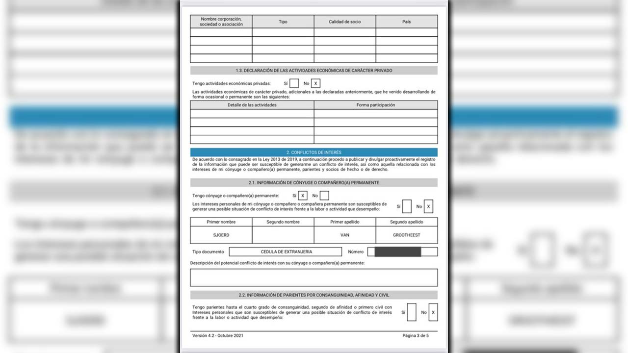 La ministra en el año 2022, en la declaración de conflictos de interés, puso al holandés como su esposo, pero para el año 2023, en la última declaración, publicada el 22 de junio, la ministra actualizó el documento diciendo que no tiene pareja permanente.