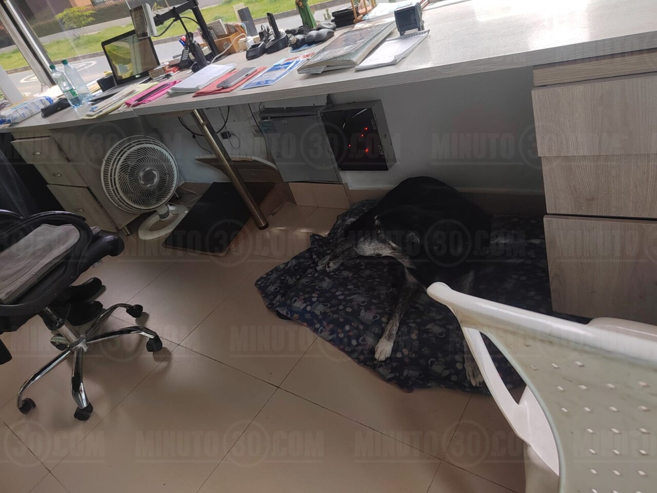 La negra está atenta, desde la caseta de los vigilantes, acompañándolos en su labor. Foto: Minuto30.com