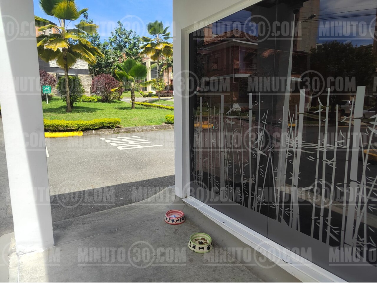 Las coquitas de la comida y el agua de “la negra”, permanecen disponibles las 24 horas para la perrita, cerca a la portería. Foto: Minuto30.com