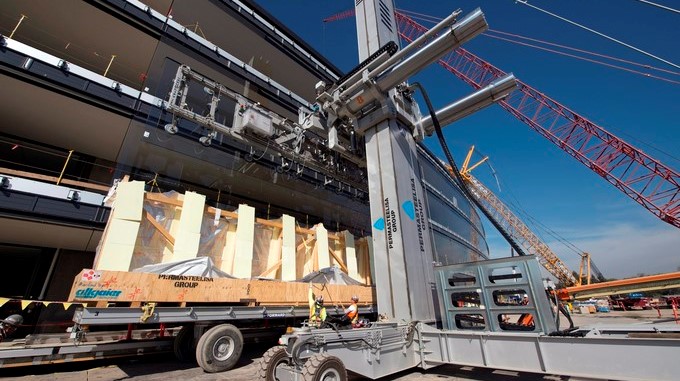 The large curved glass panes are being installed via a Cimolai manipulator at the Apple Campus 2