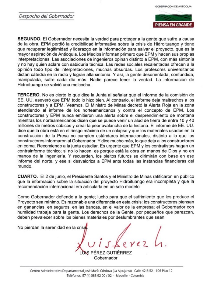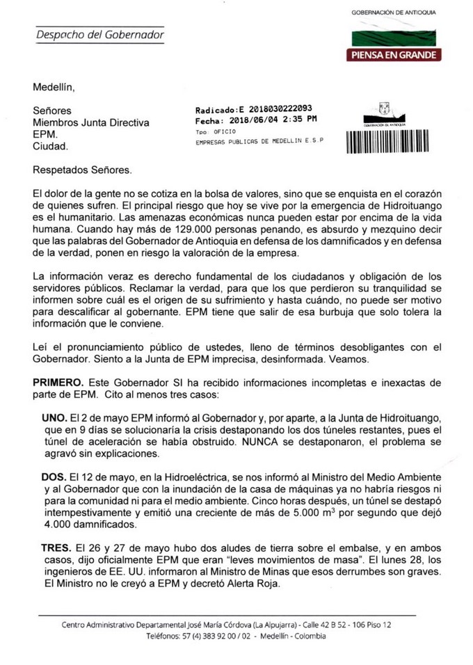 Sobre las contradicciones que se han presentado en los últimos días sobre la verdadera situación de la obra de la hidroeléctrica de Ituango, el gobernador de Antioquia Luis Pérez Gutiérrez, le envió una carta a la junta directiva de EPM, en la que expuso los motivos de los cuestionamientos que está realizando frente a la información que ha recibido acerca de la contingencia que tiene afectados los municipios aguas abajo del proyecto.