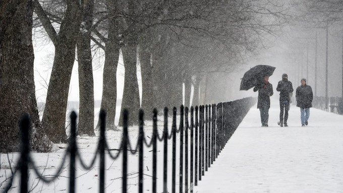 Unas personas caminan cerca al Monumento a Abraham Lincoln durante una tormenta de nieve