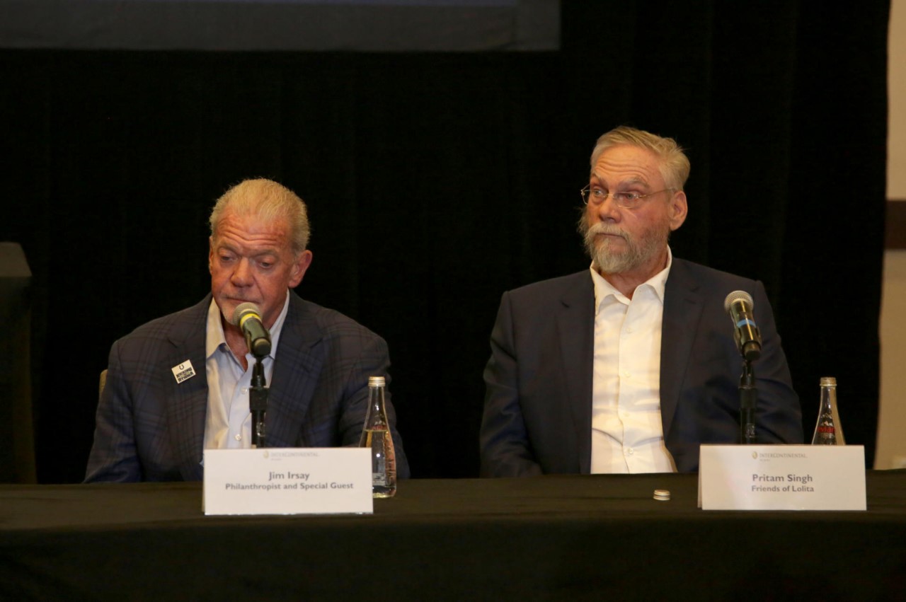El filántropo e invitado especial Jim Irsay (i) y Pritam Singh (d), uno de los fundadores de la organización Amigos de Lolita, participan en una rueda de prensa este 30 de marzo de 2023, en Miami (Estados Unidos). EFE/ Marlon Pacheco