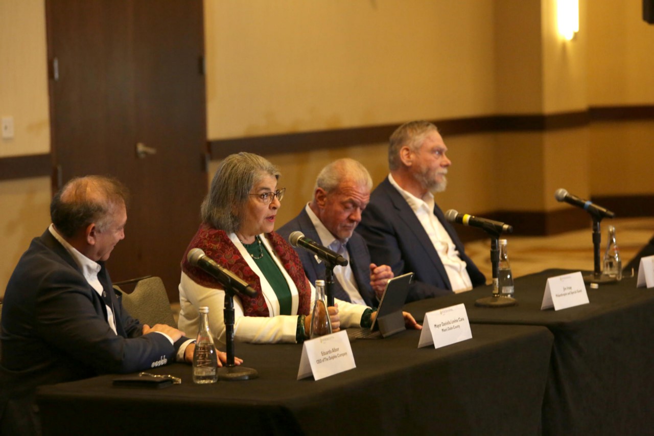 Eduardo Albor, director general de The Dolphin Company, compañía concesionaria del Miami Seaquarium; la alcaldesa del condado de Miami Dade, Daniella Levine Cava; el filántropo e invitado especial Jim Irsay, y Pritam Singh, uno de los fundadores de la organización Amigos de Lolita, participan durante una rueda de prensa este 30 de marzo de 2023, en Miami (Estados Unidos). EFE/ Marlon Pacheco