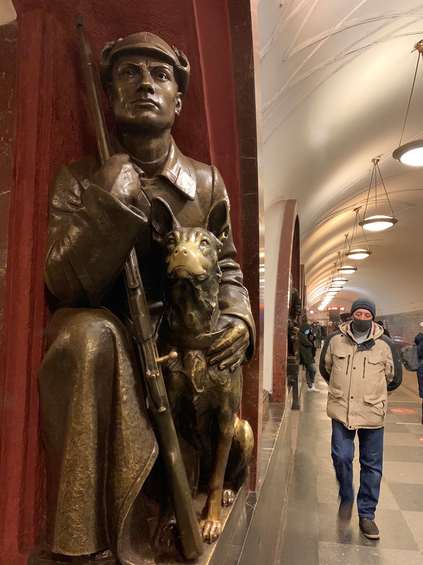 Un hombre camina junto a una de las cuatro estatuas de un guardia de fronteras con el perro “de la suerte”, este sábado en la estación Plaza de la Revolución del metro de Moscú, Rusia. EFE/Anush Janbabian
