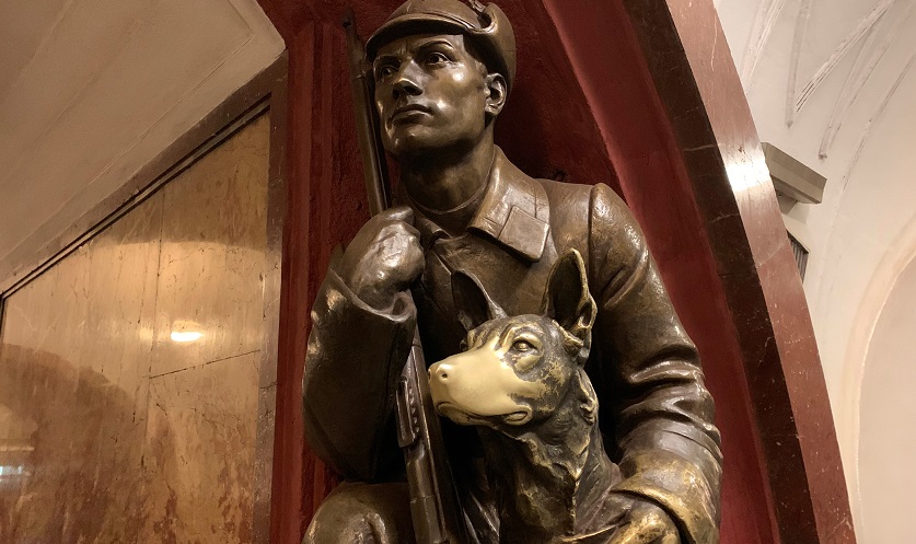 Un hombre camina junto a una de las cuatro estatuas de un guardia de fronteras con el perro “de la suerte”, este sábado en la estación Plaza de la Revolución del metro de Moscú, Rusia. EFE/Anush Janbabian