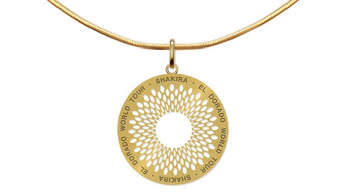 Collar con colgante en relieve dorado marcado con “Shakira El Dorado World Tour”. Se encuentra disponible en la web http://www.shakira.com/tour