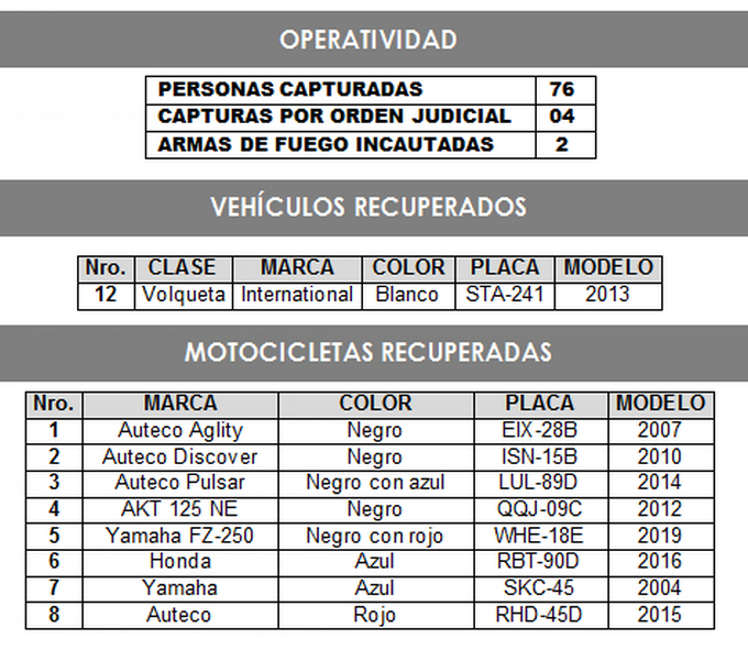 En las acciones y operaciones en contra el hurto en el territorio del Valle de Aburrá, fueron recuperadas 8 motocicletas y una volqueta. Las autoridades dieron a conocer las placas de estos vehículos.