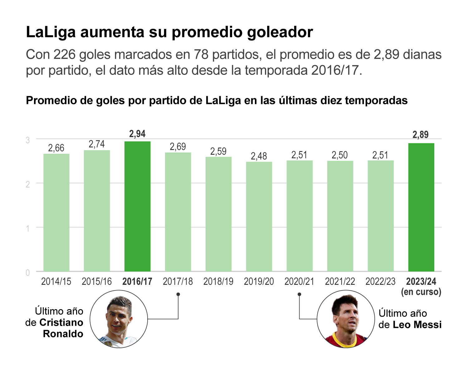 No se registraba un porcentaje parecido desde la campaña 2016-17 con 2,94. Aquella temporada el Real Madrid se proclamó campeón con 106 dianas, diez menos que el Barcelona, que terminó en segunda posición.
