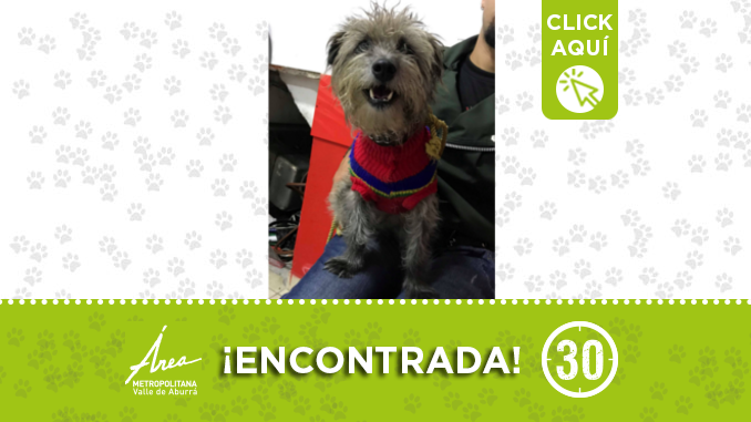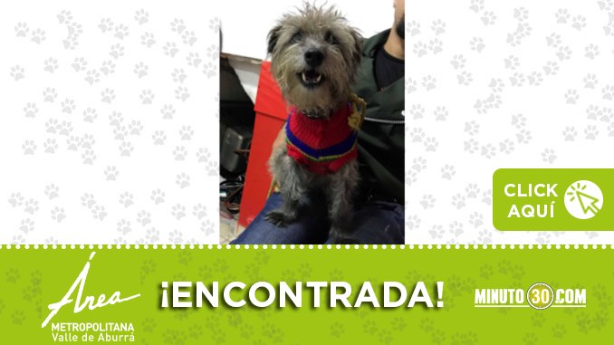 Esta perrita fue encontrada por Gratamira, sector Boyacá Las Brisas, cerca a la iglesia San Gregorio Magno, en Bello, tiene un collar plata y un buso de colores. Si usted lo reconoce o sabe de sus dueños por favor llamar al: 3014451282 ¡Difunde!