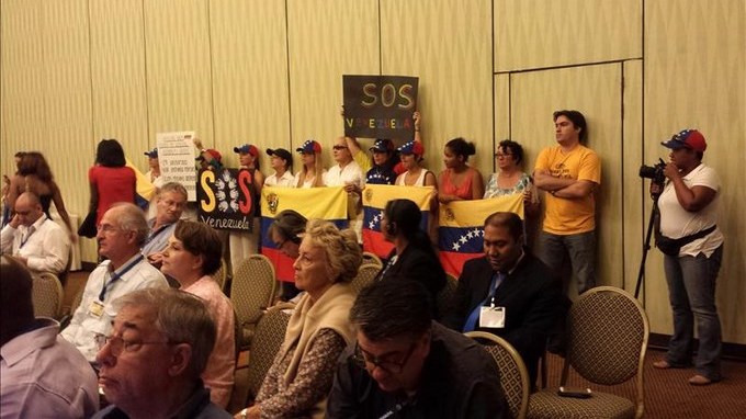 En la sala donde se reunía la Comisión de la Libertad de Prensa e Información de la SIP para estudiar el caso de Venezuela irrumpió además un grupo de jóvenes con banderas venezolanas y carteles en apoyo a quienes se están manifestando en las calles de ese país desde el pasado 12 de febrero. Todos ellos siguieron en silencio la exposición del informe.
