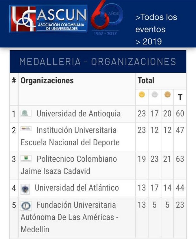 La Universidad de Antioquia ocupó el primer lugar en el medallero, seguido de la Escuela Nacional del Deporte, mientras que el Politécnico Colombiano Jaime Isaza Cadavid cerró el podio.