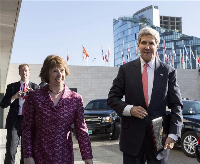 La jefa de la diplomacia comunitaria, Catherine Ashton, Catherine Ashton, da la bienvenida al secretario de Estado estadounidense, John Kerry, hoy a su llegada a una reunión de Ministros de Asuntos Exteriores de la UE en Vilna, Lituania. EFE