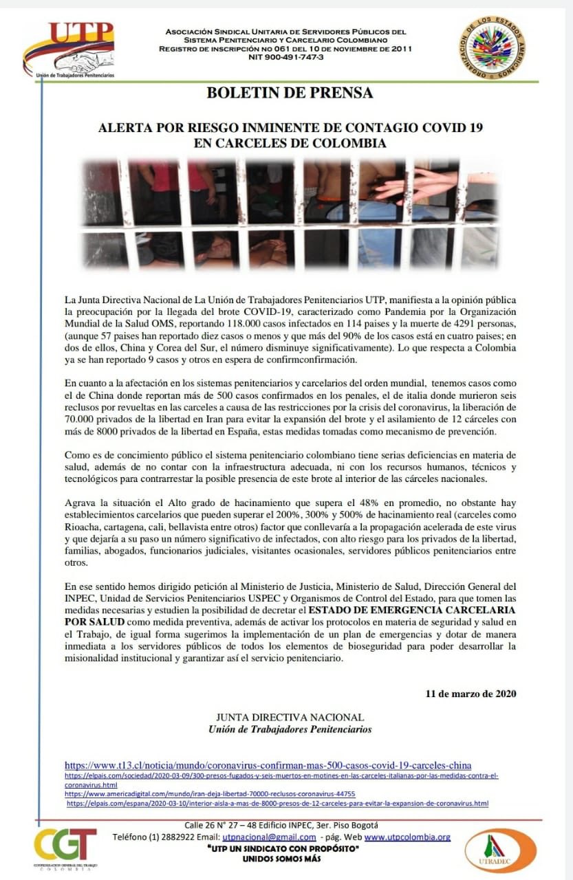 La petición de la UTP, escrita el 11 de marzo, va dirigida a El Ministerio de Justicia, El Ministerio de Defensa, la dirección general del INPEC y los organizamos de control del estado. Con el fin de que se acaten las medidas de seguridad en el trabajo y seguridad, al igual que la dotación necesaria para los empleados de las distintas cárceles del país.