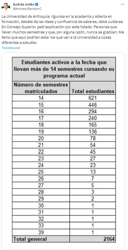 El Gobernador de Antioquia, Andrés Julián Rendón, reveló un listado de 2164 estudiantes que llevan entre 14 y 39 semestres matriculados en la Universidad de Antioquia y aún no logran graduarse.