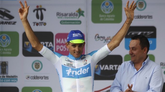 MED704. LA CEJA (COLOMBIA), 01/08/2017.- El ciclista español Oscar Sevilla, del equipo Medellín-Inder, celebra luego de recibir la camiseta como mejor extranjero al termino de la primera etapa de la 67 Vuelta a Colombia que comenzó hoy, martes 1 de agosto de 2017, en el municipio de La Ceja, departamento de Antioquia (Colombia). La primera etapa de la Vuelta a Colombia fue una contrarreloj por equipos de 18.4 km entre los municipios antioqueños de Rionegro y La Ceja, al oriente de Colombia. EFE/Luis Eduardo Noriega A.