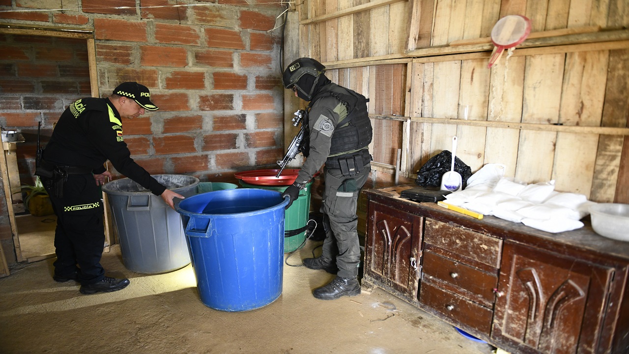 Los uniformados estaban en la parte alta de la comuna Manrique, cuando ven una construcción artesanal, con ladrillos, tablas y plástico, la cual tenía contenedores y canecas plásticas a la vista.