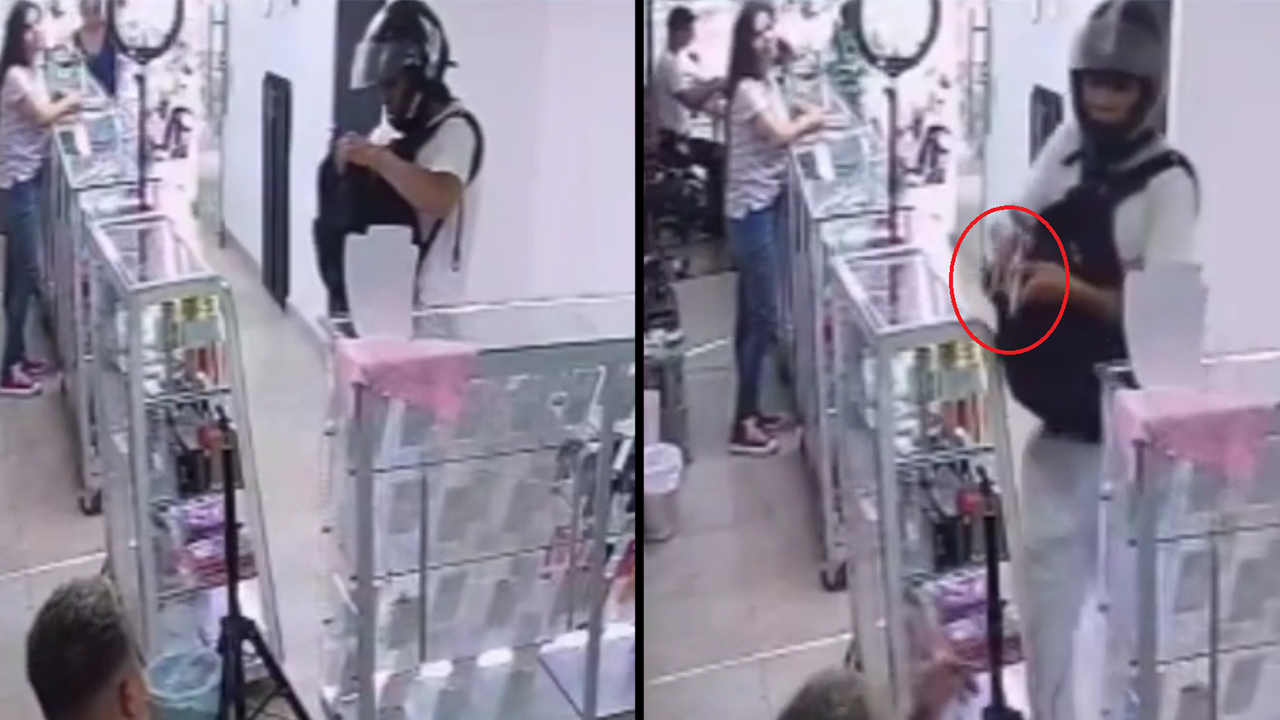 El hombre ingresa al local como cliente, e incluso pregunta por un producto, mientras una mujer se dispone a atenderlo, él se toma su tiempo para buscar el arma en su bolso y de repente, saca el arma y le quita a un ciudadano una cadena de oro, un celular y otros objetos.