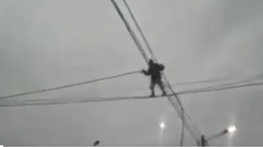 Como si fuera un malabarista de un circo, el sujeto caminaba por encima de uno de los cables, mientras iba tomando el otro.