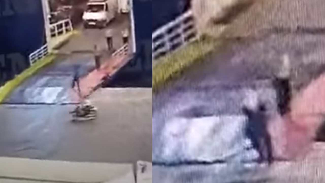 En las imágenes se observa al hombre corriendo para cruzar la puerta del barco, pero lo detienen dos hombres y uno de ellos inicia un forcejeo con él, que termina en el trágico desenlace.