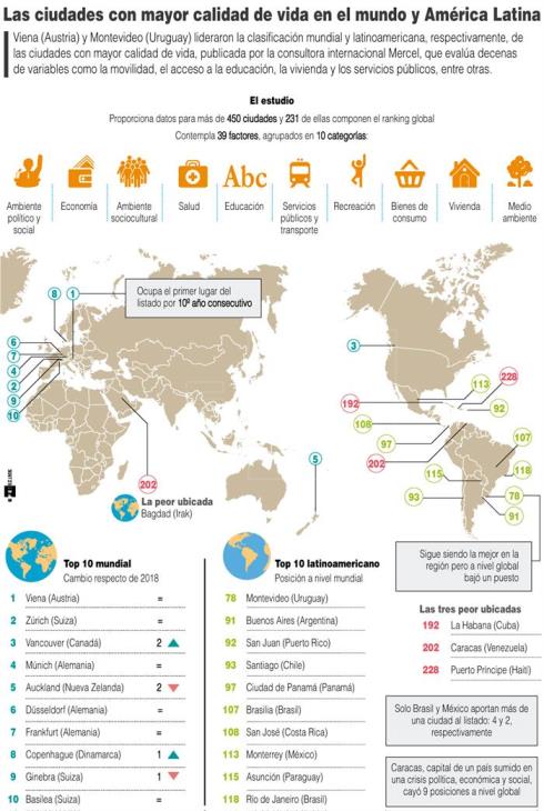 Viena (Austria) y Montevideo (Uruguay) lideraron la clasificación mundial y latinoamericana, respectivamente, de las ciudades con mayor calidad de vida. El listado, publicado por la consultora internacional Mercel, evalúa decenas de variables como la movilidad, el acceso a la educación, la vivienda y los servicios públicos, entre otras.